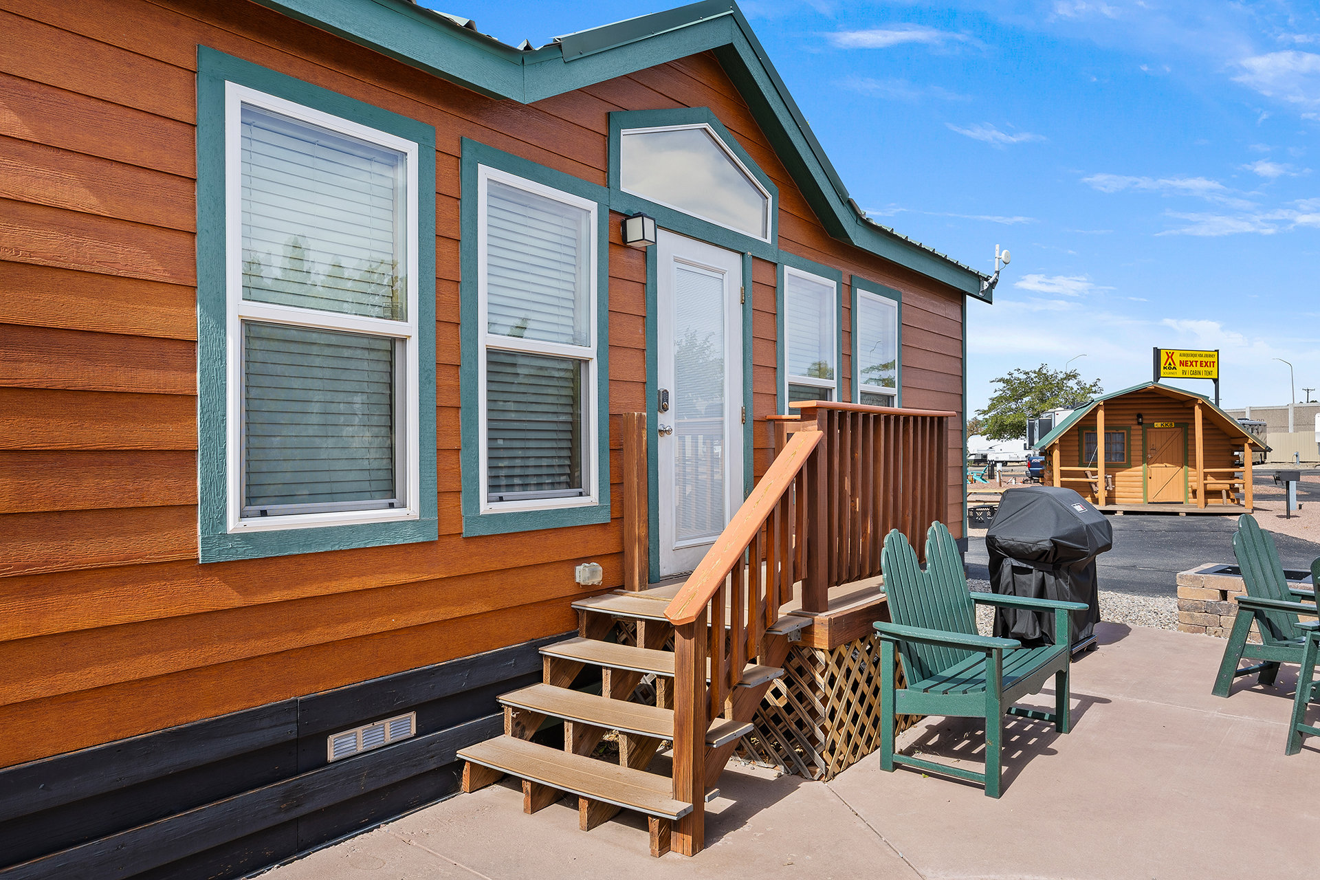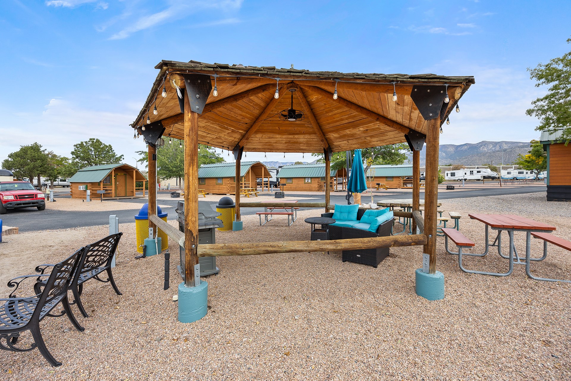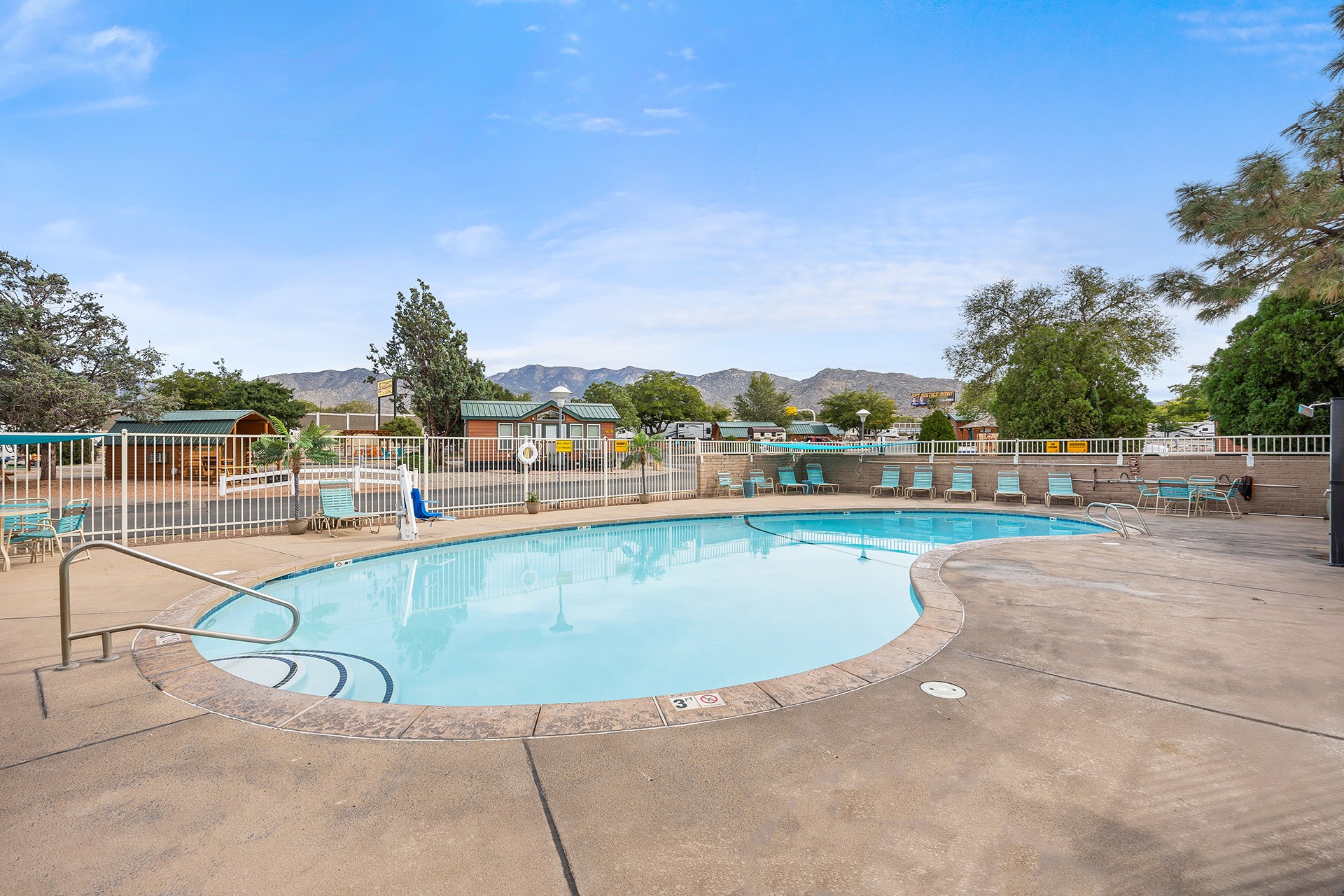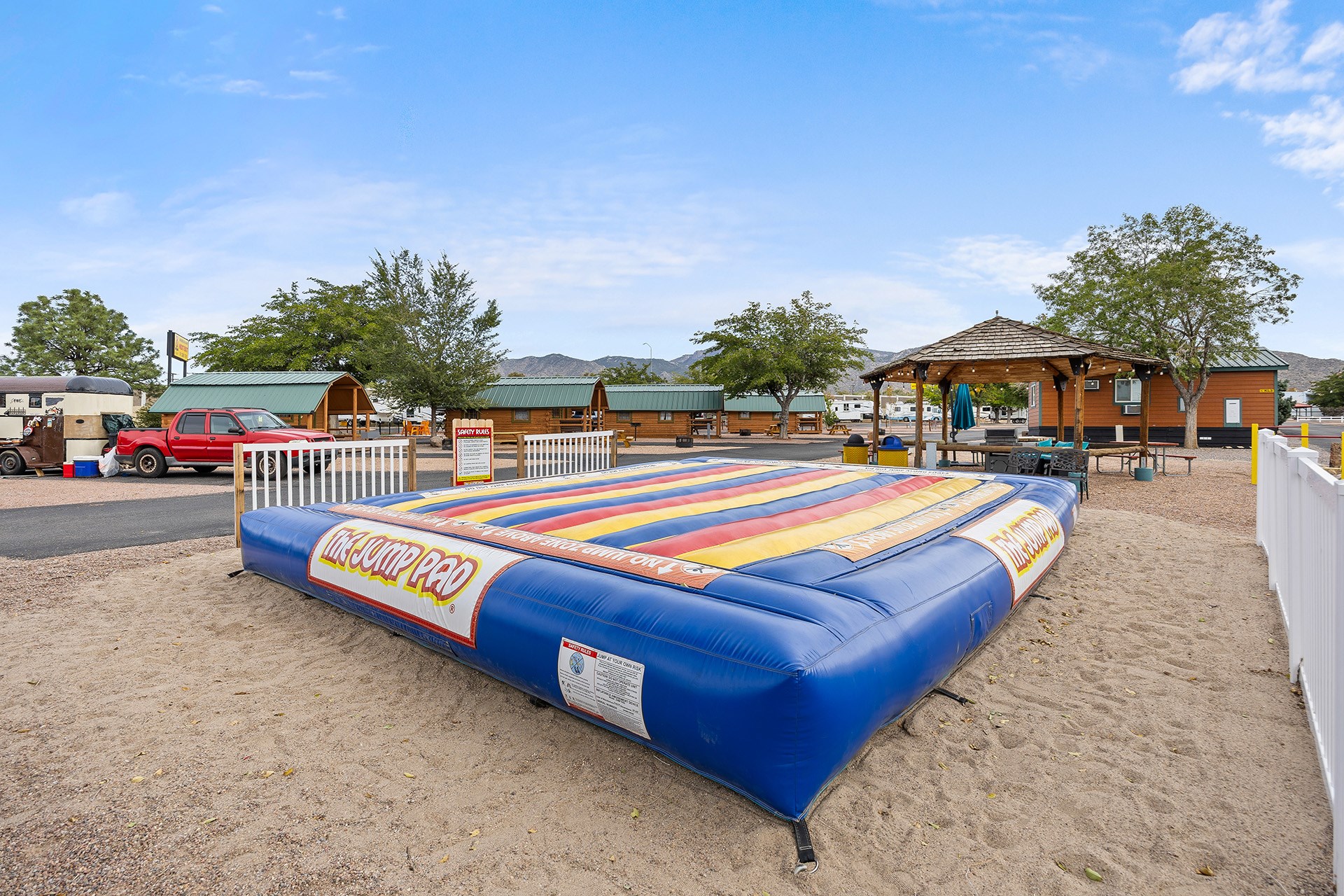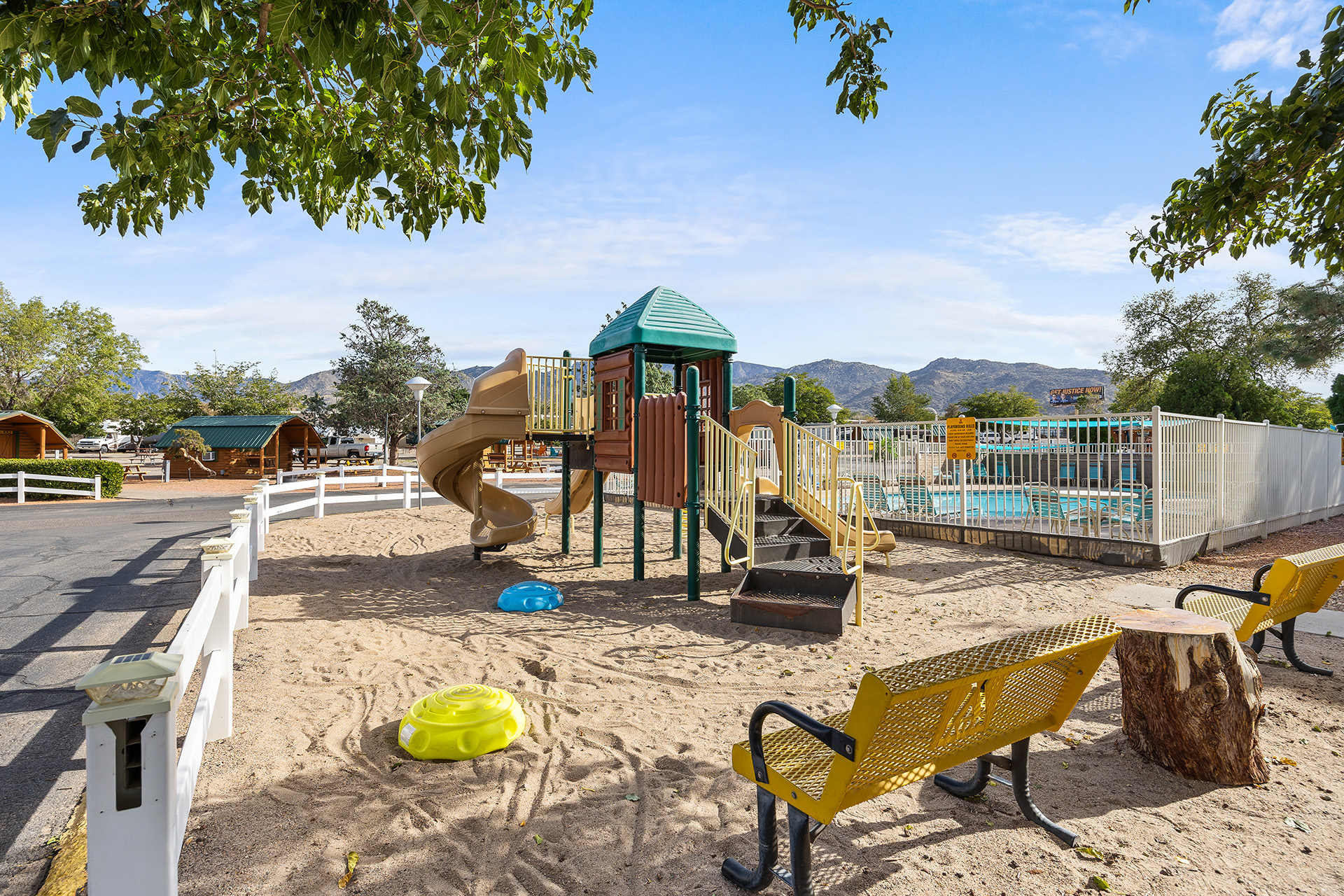 Albuquerque KOA Journey is a beautiful campground near the Sandia Mountains, right off of Historic Route 66. Whether you are looking for big rig friendly 75 foot RV sites, cabins or tent camping, we are your Albuquerque campground! For RV sites, we offer daily, weekly and monthly stays! Relax during your stay and enjoy various recreation activities including our swimming pool, jump zone, bike rentals, indoor hot tub, sauna, mini golf, playground and Kamp K9 dog parks. We are pet friendly and offer enclosed, off leash Paw Pen RV sites for your furry friends. Take a virtual tour of our campground here!