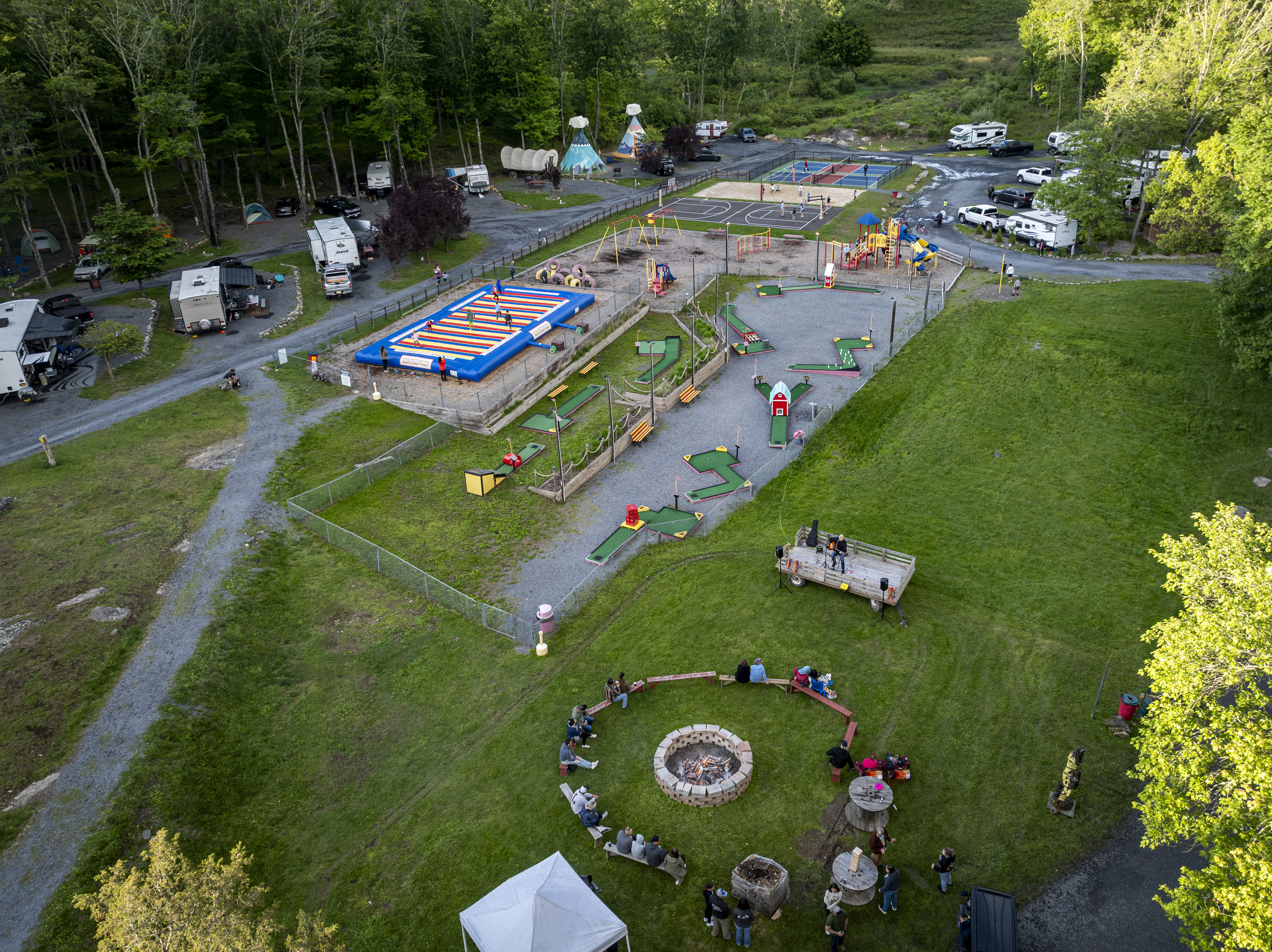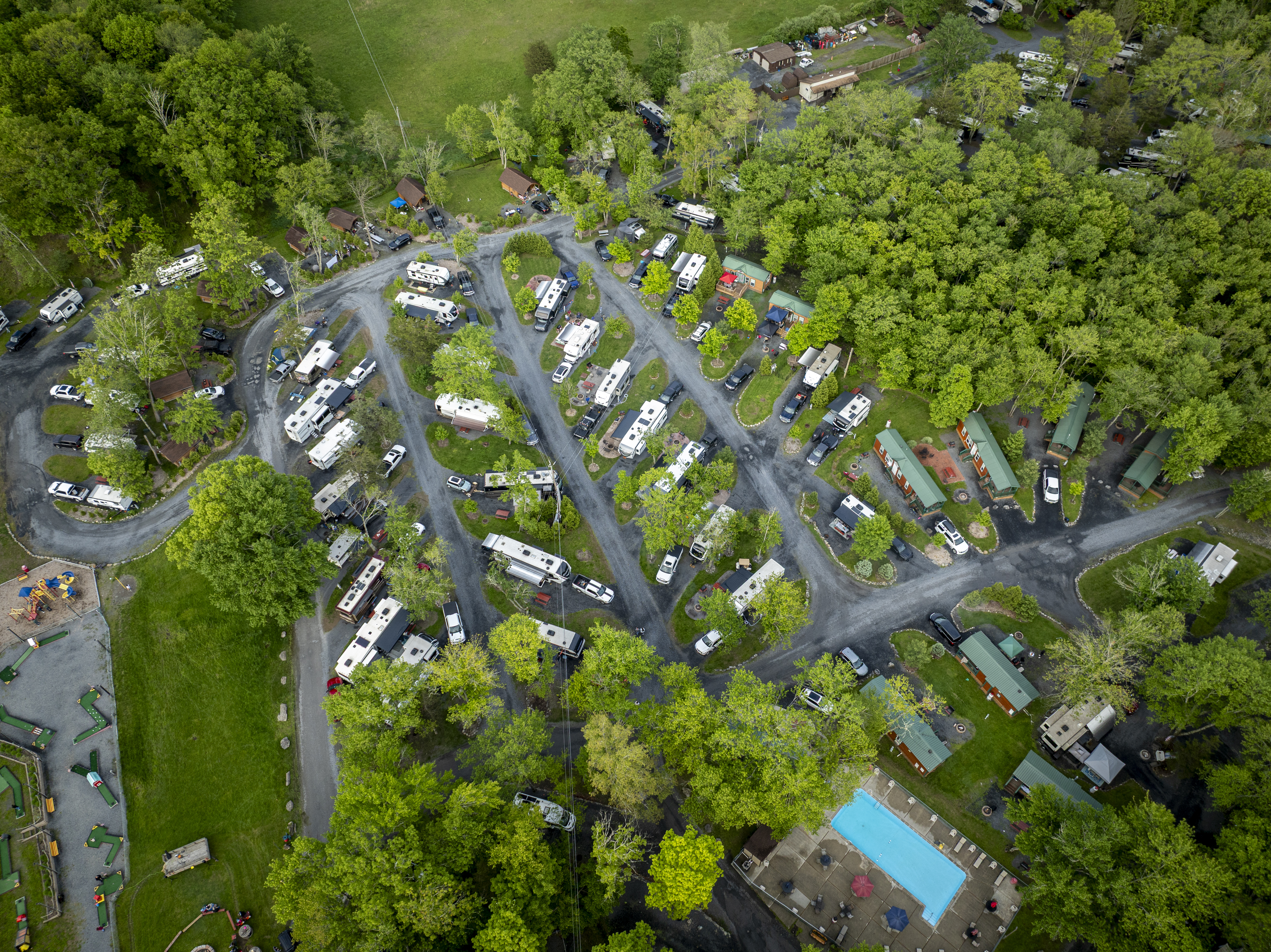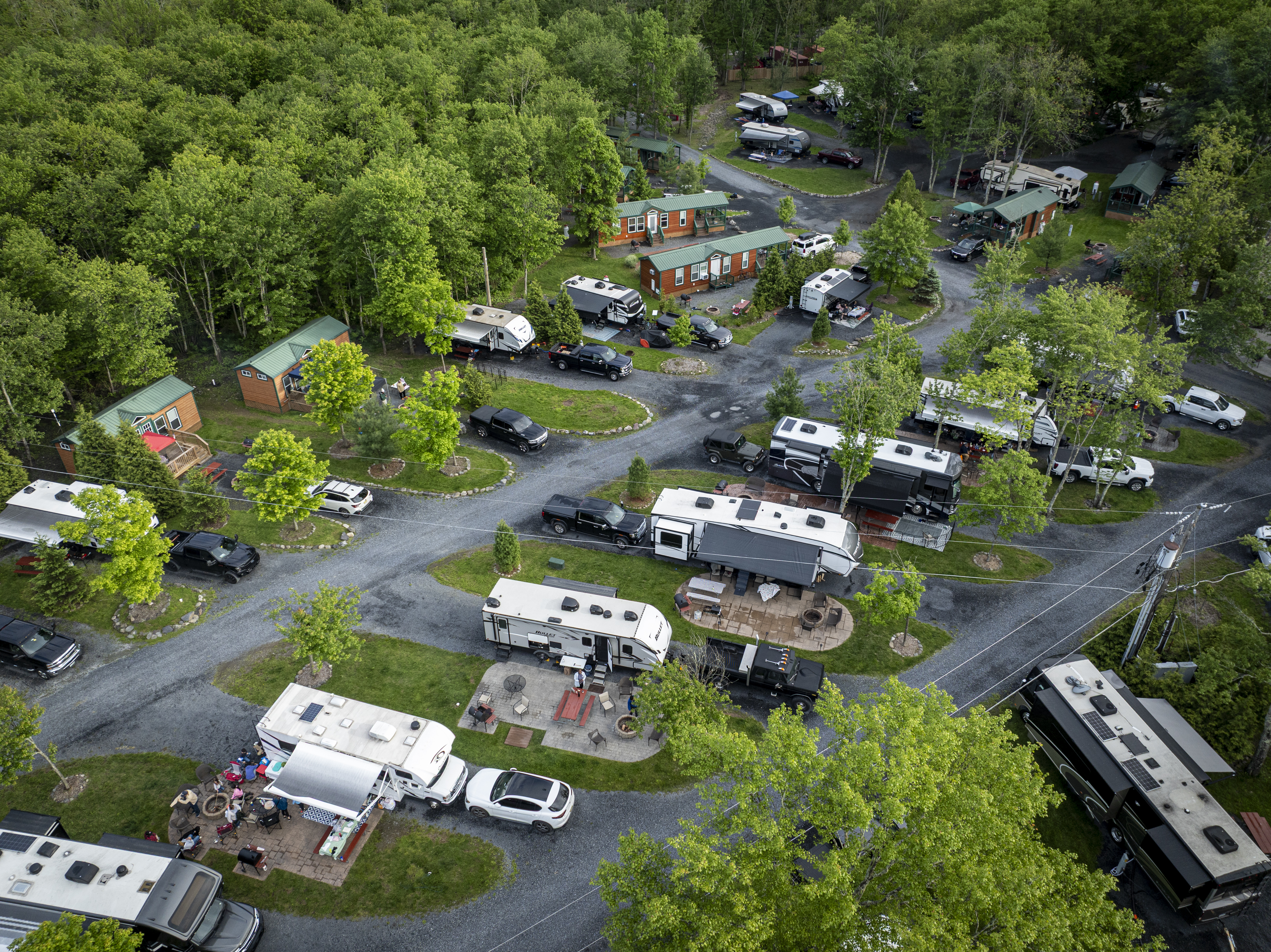 The Delaware Water Gap-Pocono Mountain KOA campground offers the Pocono Mountains' finest family camping! With level pull-through sites as long as 102 feet available, our campground is truly “Big Rig Friendly!” Patio sites, with upscale seating and one-of-a-kind campfire elements, are sure to please even our most elite campers. No RV? No problem! Enjoy a comfortable stay in one of our rustic or deluxe cabins. Our level tent sites offer scenic surroundings for those who want to “rough it” in style.
