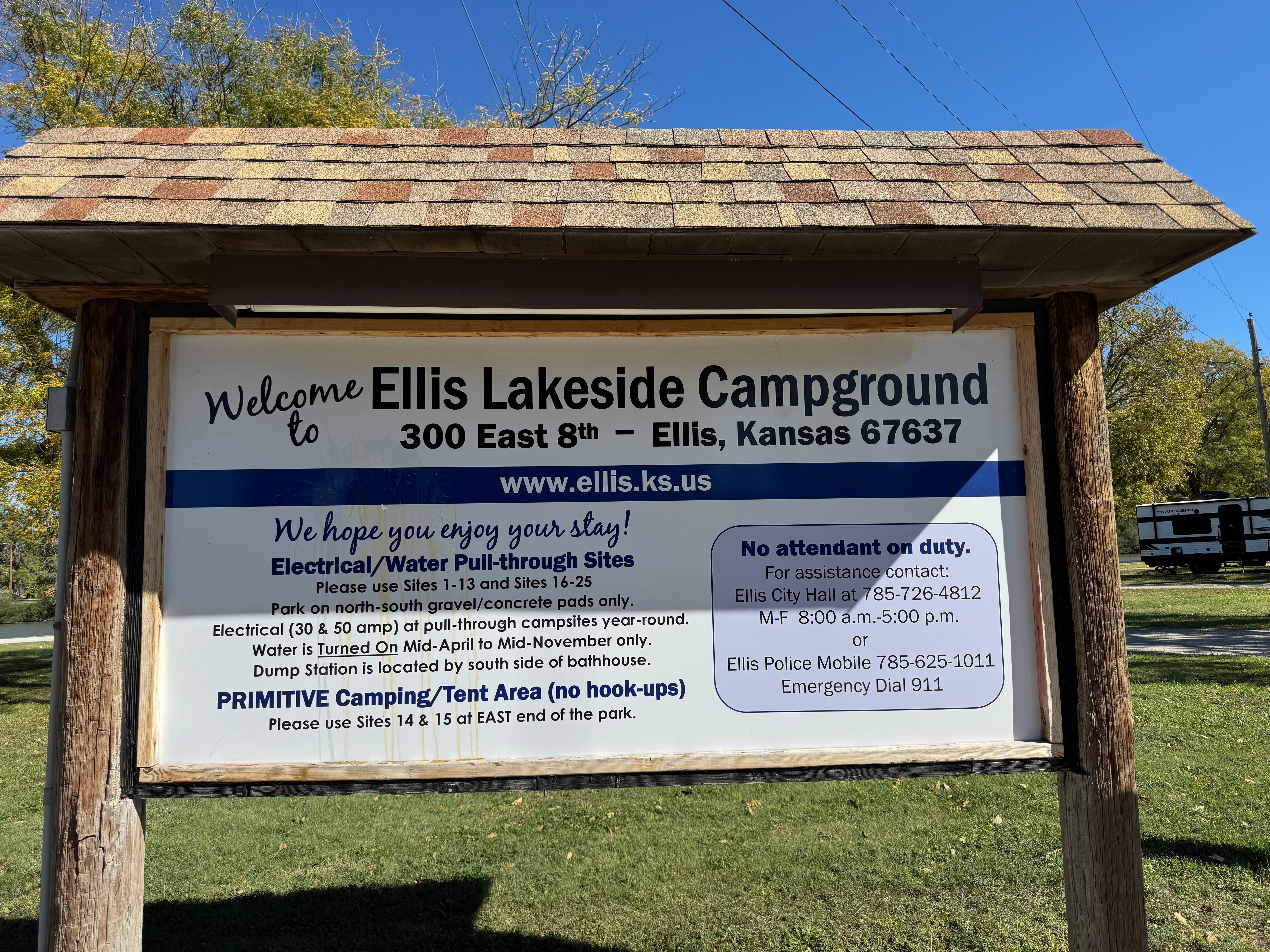 Stay at Ellis Lakeside Campground, located in Ellis, Kansas. With its shady venue, playground, and fishing pier, it offers plenty of activities for campers. Observe local wildlife, go fishing, or go boating on Big Creek. All campsites are pull through and include water and electrical hookups, as well as WiFi. Reservations are not accepted, so be sure to arrive early!